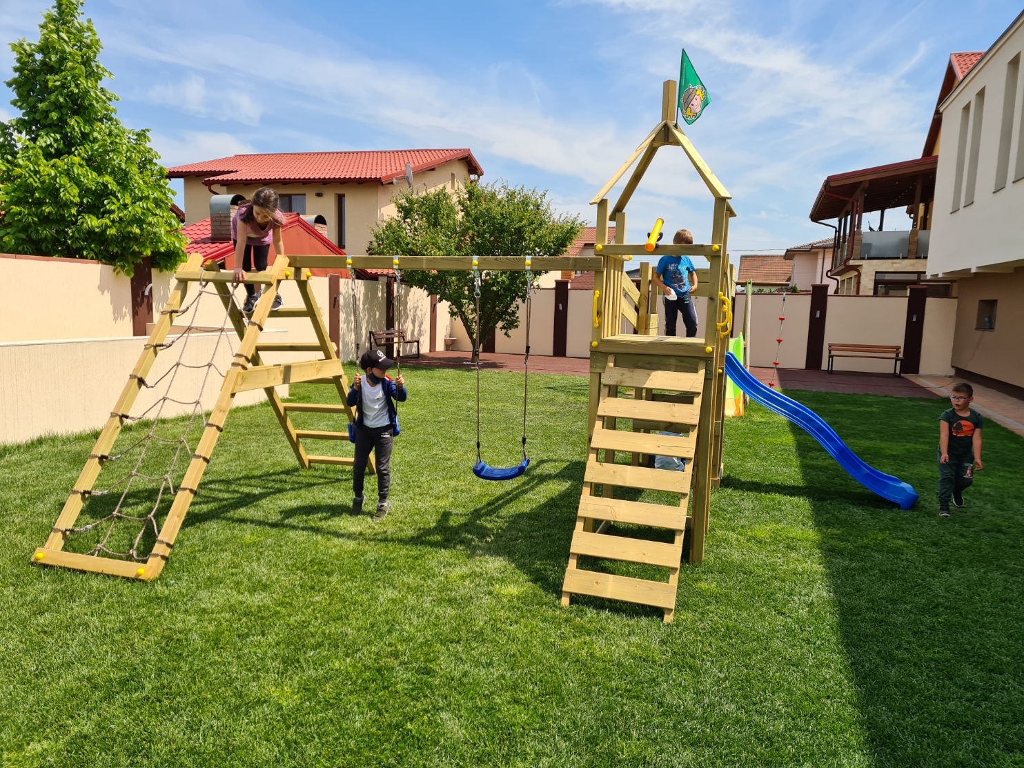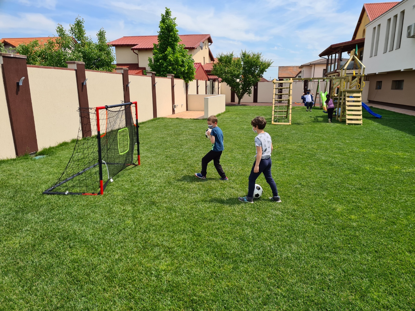 Locație friendly, având la dispoziție un spațiu interior de 440 m², spațiu de joacă exterior cu iarbă naturală de 600 m², teren de 4.000 m² pentru multe activități în aer liber, teren de baschet acoperit cu tartan si traseu exterior de tip AVENTURA PARK.